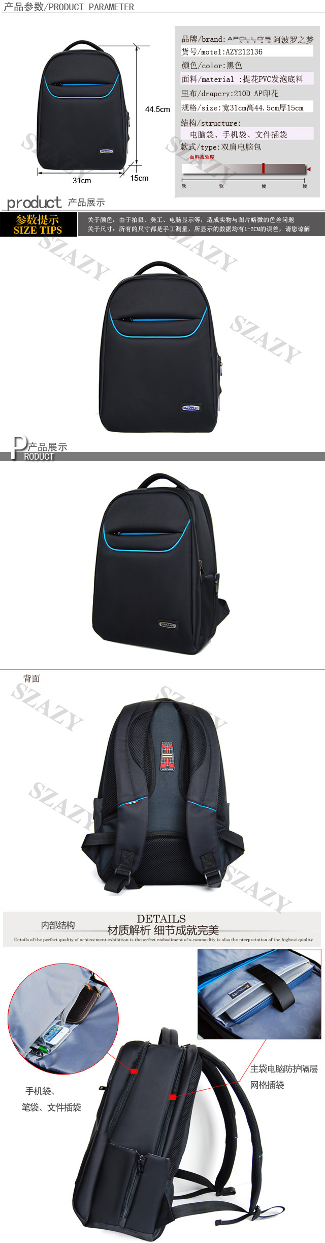 - 电脑双肩背包,主料采用提花尼龙PVC料,结实耐磨。前幅采用蓝色装饰片和打枣设计,商务中透露着活力气息,庄重经典。此款背包设有多功能袋,前袋内可放置手机,笔插及证件等.主袋内设有加厚PE棉电脑插袋,妥善保护您的电脑。内部空间大,设有可透视网格插袋,方便分开放置不同物品.侧幅拉链袋设计可放置水杯,雨伞,杂物等,安全方便。背幅采用加厚三明治网,柔软舒适透气,减少背部的摩擦.