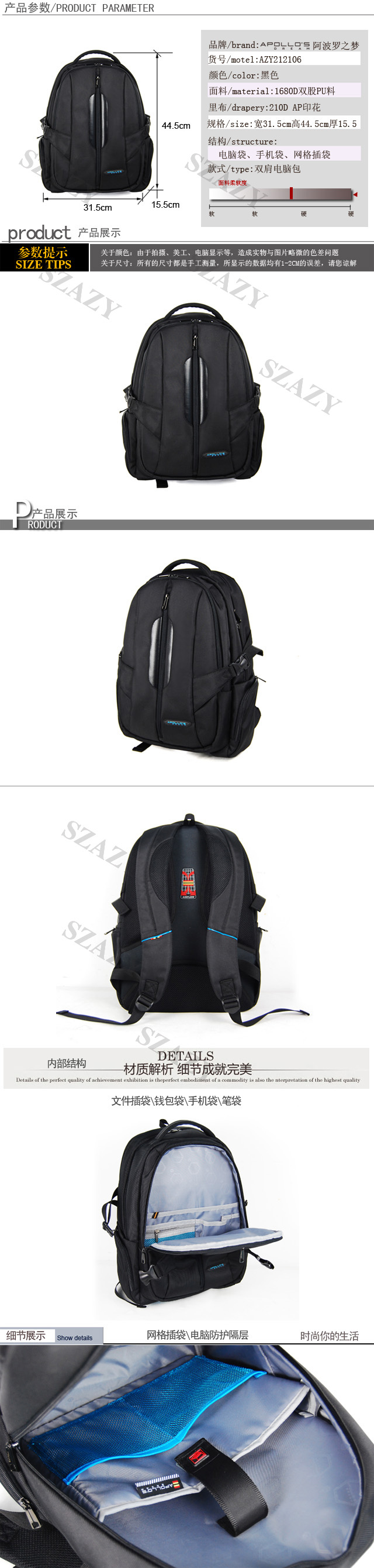 - 主料采用提花尼龙料,具有耐磨擦性能.前幅设有文件插袋,主袋内设有PE棉保护防震的电脑袋,前袋内设有文件插袋及多功能袋,可放置手机,笔,证件等物品.背幅采用加厚PE棉和三文治网料,舒适透气,减少背部的摩擦!