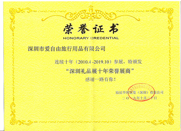 - 爱自由箱包荣获“深圳礼品展十年荣誉展商”称号