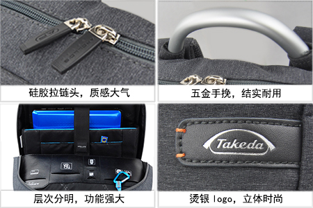武田中国款背包,选用爱自由箱包2015年热销新品,该款背包外形简单的深灰色加入条形土黄色,色彩简单成稳;在底部的设计中加入PU皮料包裹底部,搭配五金提手与拉头,让整体显得优雅大方。在整体的美观上,内部的存储更是不能马虎设计。前幅设有拉链袋,A4大小深度,可存放A4用品;两侧设有经典存放层,打破传统网格设计,以主色加入松紧带设计伸缩自如的存放层;一层主袋设有专业电脑层、IPAD层和自由层,主袋前幅更设有笔槽、烟位槽和钱包槽,将小件用品集中存放,方便拿取,十分适合上班+生活两用。