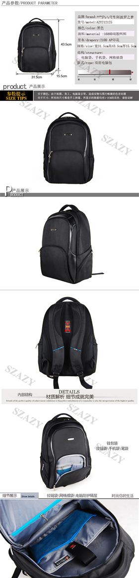电脑双肩背包,采用提花尼龙料结实耐磨。款式简约,功能丰富。前幅拉链袋可放置杂志文件等,主拉链袋采用双层拉链,外层拉链即为伸缩围拉链,也可作为防护拉链层,打开后可增加袋内空间。内拉链袋内设有加厚PE棉电脑袋,可透视网袋及手机位,笔插位和证件袋。背幅采用加厚PE棉和三文治网料,舒适透气,减少背部的摩擦!