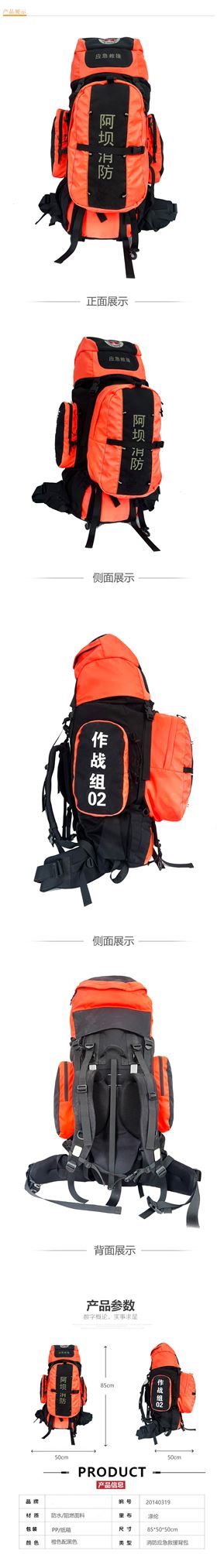 该款应急救援背包是爱自由箱包根据客户要求专属定制的,精选优质防水、阻燃面料,防水、阻燃效果好,结实耐用的同时更切合消防应急场景使用要求,提高背包在特殊使用环境下的安全性,以便更好的保护包内物品不受环境影响而损坏,给使用人员提供更好的后勤保障。背包整体采用大容量、多隔层空间设计,可分类存放氧气瓶、灭火器、救援绳、救生衣、医疗急救包、水杯、防毒面具等应急物品,背包正面以及肩带处都设有多处外挂装置,方便部分东西外置携带,收纳功能十分强大。背包采用悬浮式网状背幅系统,舒适透气,加宽、加厚弧形PE棉透气背带搭配护脊腰带,可分散背包整体背负压力,减少背负摩擦力度,符合人体工学的同时,让背负更轻松、舒适,背包所有承重部位,均采用打枣工艺车缝加固,提高背包承重能力,让背包更结实耐用。