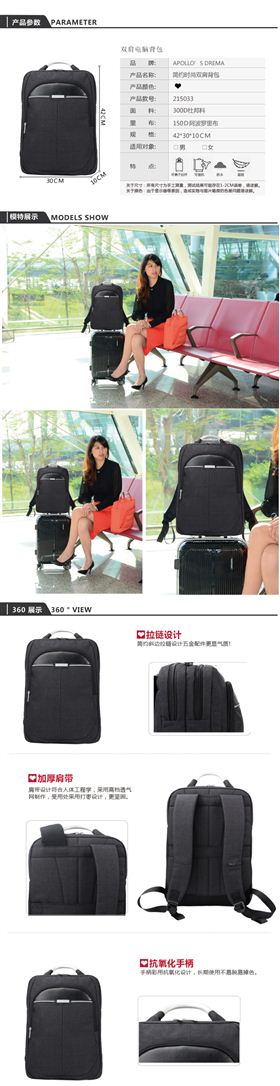 经典商务黑色背包系列打造,加入点点磨砂,让枯燥的黑色更有独特时尚感。整体立体圆形设计,前幅以线条的知性与弯曲调动背包的时尚气息,在前幅加入皮革料,杜邦与皮料配搭凸显的尊贵感,加入珍珠叻品牌标志与金属五金拉头,彰显尊贵商务气质与品牌品味。提手设为不锈铝合金提手,饱满而符合人体握手式,有效的减少背包对人体手挽的压力伤害;五金双拉头半开式设计,双向拉开背包,减少背包开关时间,并有效的保护拉链长期不易受损。