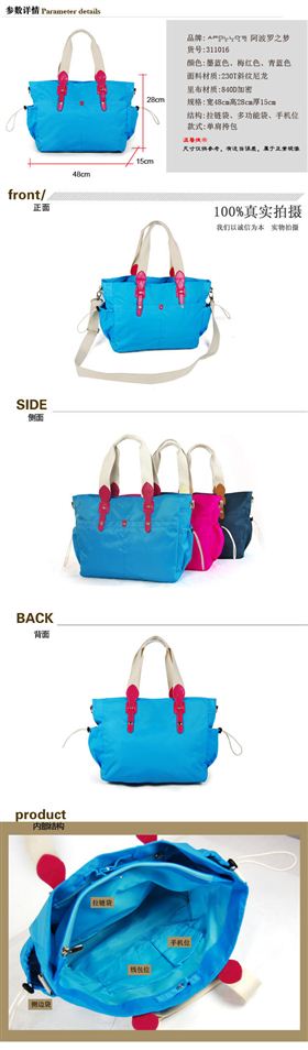 主料采用230T斜纹料尼龙料,耐磨性高.主袋内设计有多功能袋,可放置手机,笔,笔记本等物品.设计美观时尚.颜色艳丽.