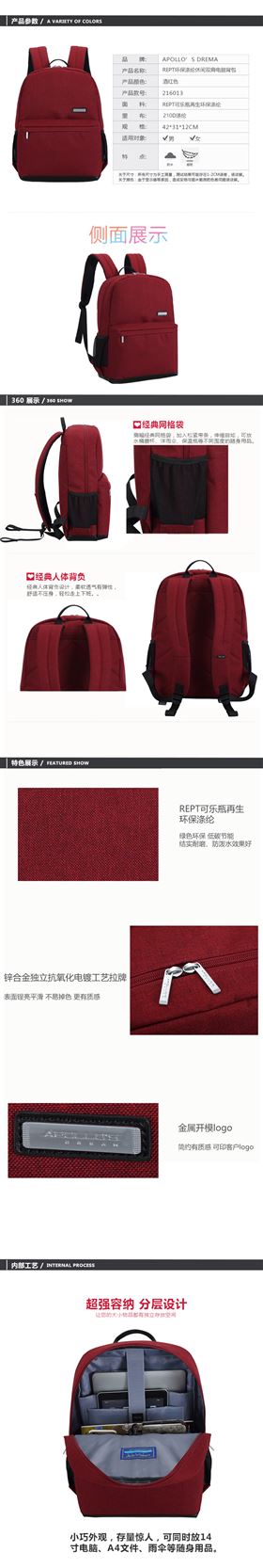 REPT环保涤纶休闲双肩电脑背包,精选环保RPET材质,结实耐用,防泼水性能好,低碳节能、绿色发展,从“包”做起,把环保背在身上。爱自由箱包用实际产品向大家诠释“低碳节能、绿色发展”的发展理念,以实际行动呼吁广大朋友们节约资源,保护环境,保护我们共同的地球家园。