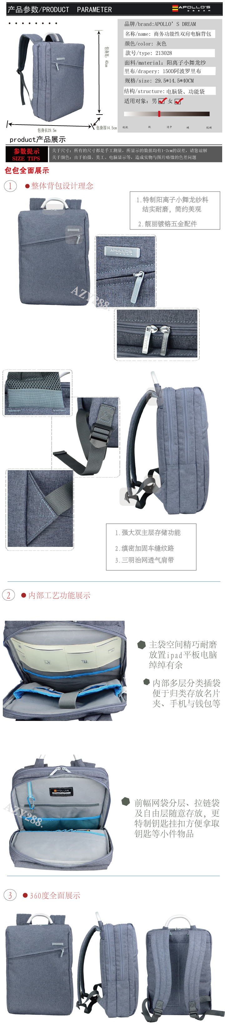 - 阿波罗之梦撞色商务休闲双肩背包,该款双肩电脑背包,采用时尚撞色拼接设计,打破纯色的单一感,有一定的视觉冲击力,加上偏于商务风格的整体版型,让背包整体更有型有格调。